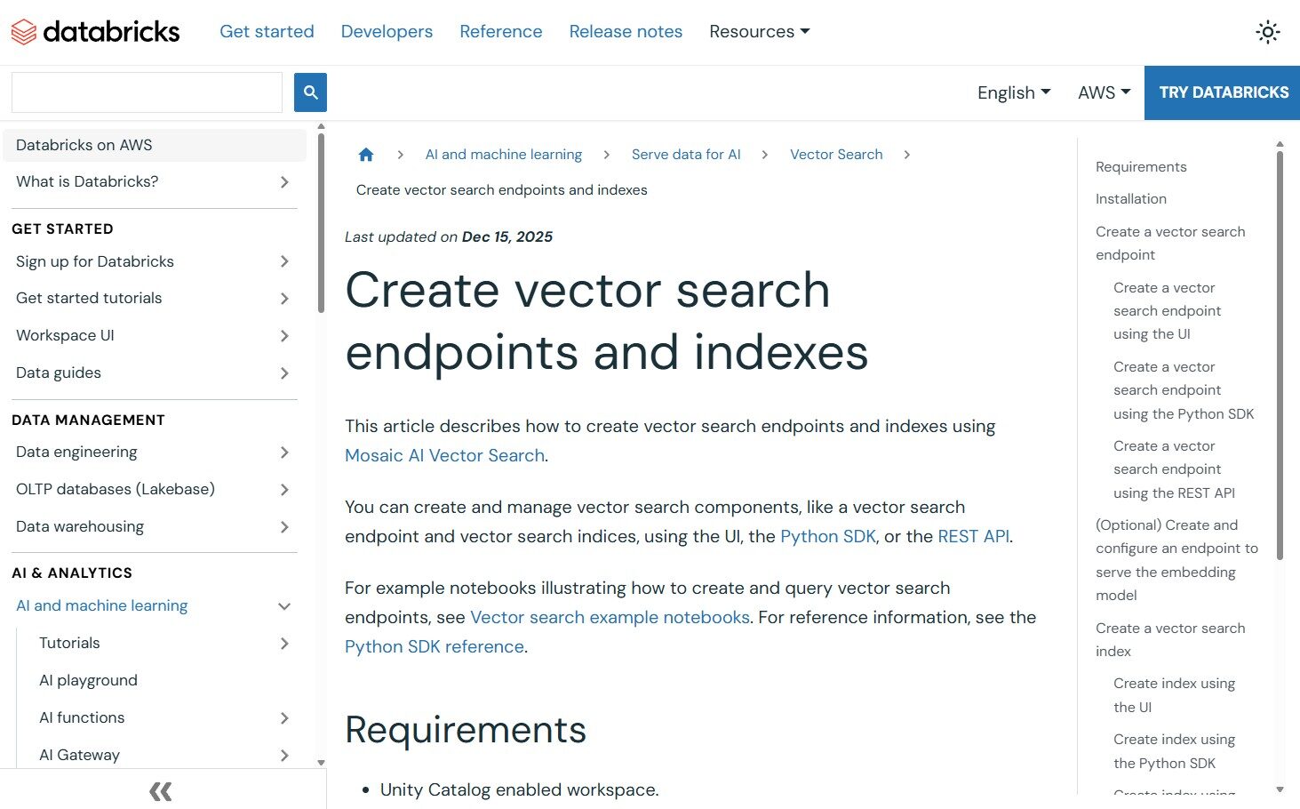 Native integration with Unity Catalog provides enterprise-grade governance, fine-grained access control, data lineage, and audit logging for vector indexes.